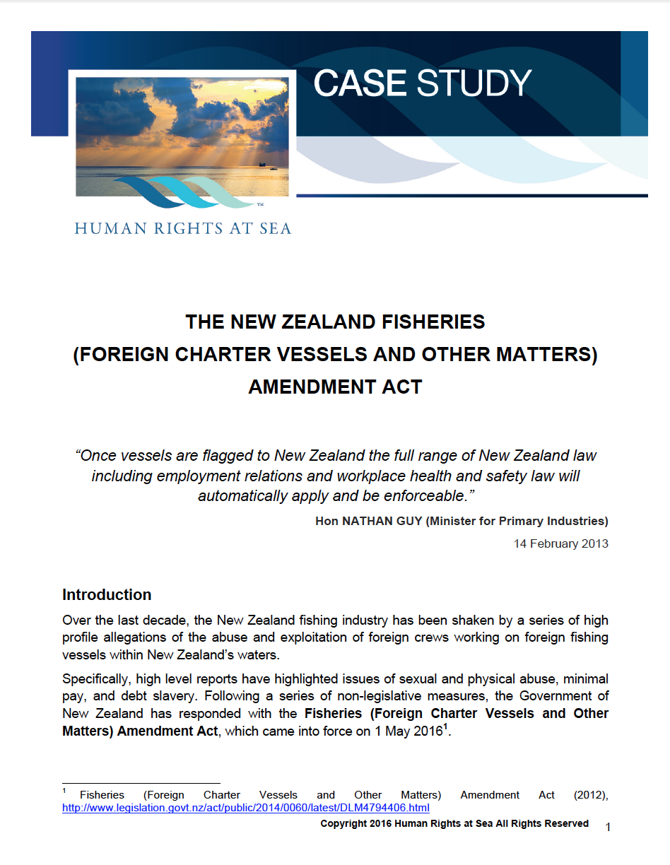 Specifically, high level reports have highlighted issues of sexual and physical abuse, minimal pay, and debt slavery. Following a series of non-legislative measures, the Government of New Zealand has responded with the Fisheries (Foreign Charter Vessels and Other Matters) Amendment Act, which came into force on 1 May 2016.