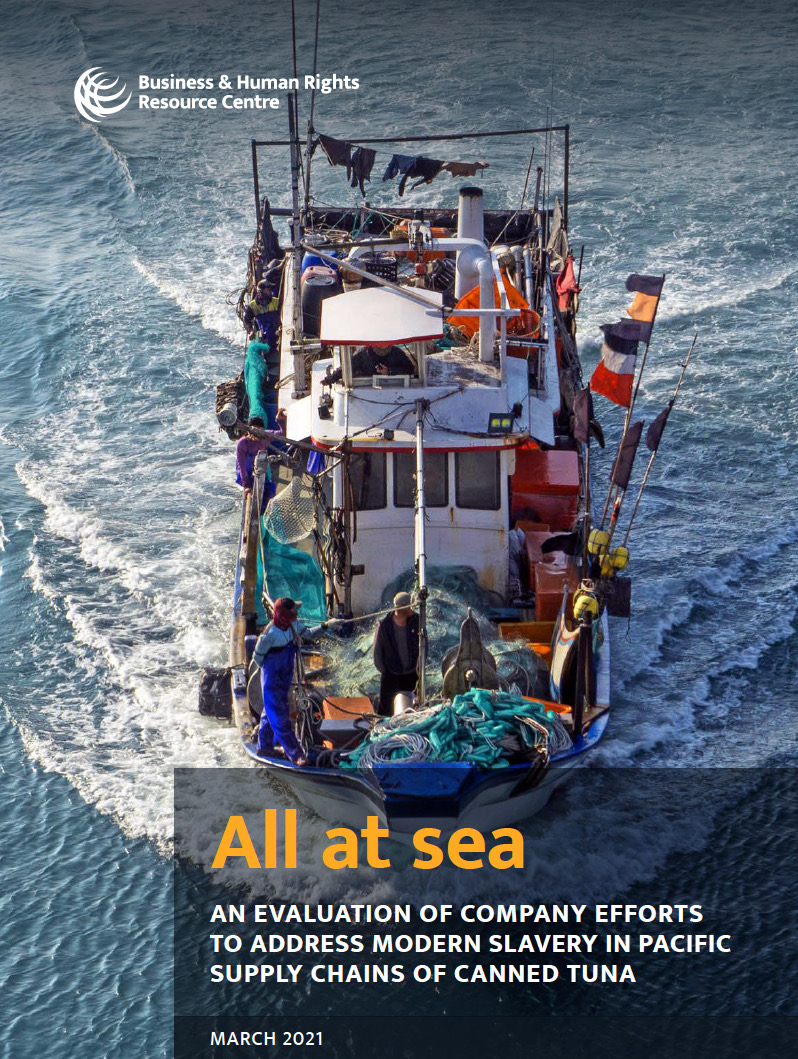24 Mar 2021Report highlights important gaps in company efforts to address modern slavery in Pacific tuna fisheriesPress Release Wednesday 24 March 2021 London.UK. Today, the Business & Human Rights Resource Centre (BHRRC) published its new briefing and platform – “ All at sea: An evaluation of company efforts toSlavery at Sea -