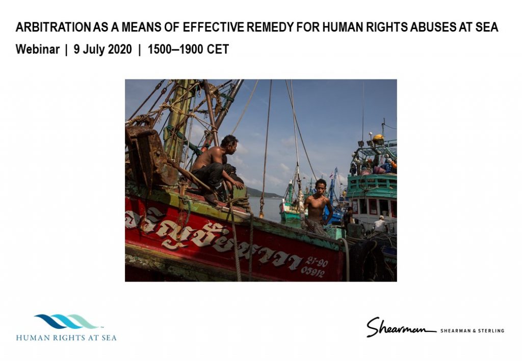12 Aug 2020Human Rights at Sea Arbitration Project Webinar videos available to viewPress Release 12 August 2020 London. UK. Following the 9 July Webinar ‘Arbitration as a Means of Effective Remedy for Human Rights abuses at Sea‘ exploring the ongoing joint project with the Paris-based arbitration practice from Shearman & Sterling LLP, the webinar videos are now available to review -