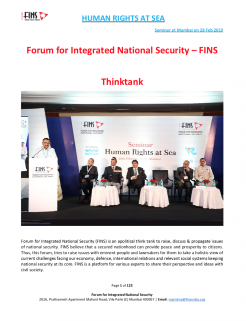 23 May 2019India. Forum for Integrated National Security Seminar ‘Human Rights at Sea’ report publishedPress Release 23 May 2019 London. UK. / Mumbai. India. With permission, Human Rights at Sea publishes the final report and recommendations of the 2019 Forum for Integrated National Security (FINS) seminar on ‘Human Rights at Sea’ held at The Leela Hotel, Mumbai on 28 February 2019. The report -
