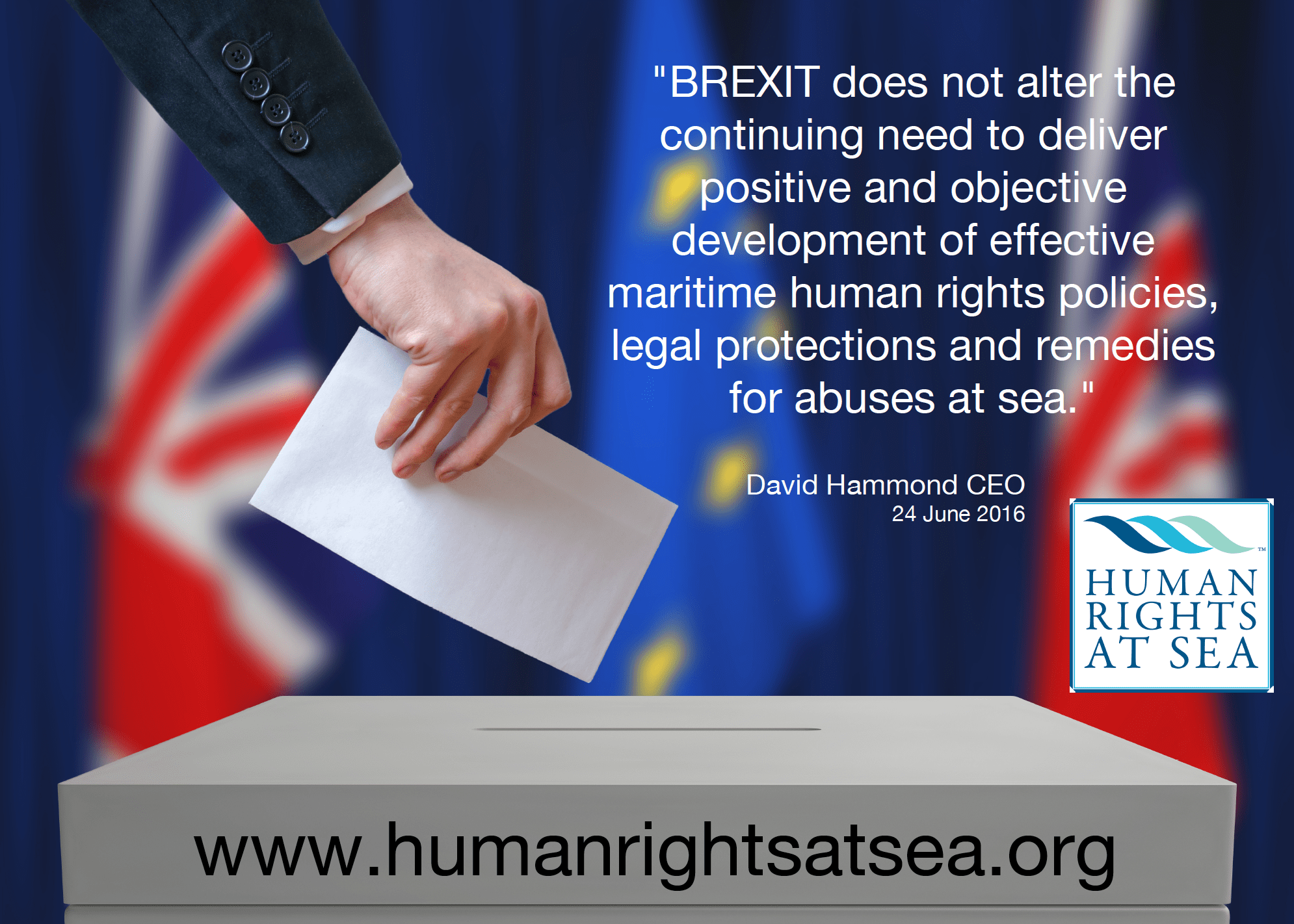 24 Jun 2016BREXIT and the future of Human Rights at SeaPRESS RELEASE Immediate Today, the British democratic process has seen a historic electorate vote in favour (52%) of leaving the European Union after 43 years of membership. Nonetheless, the fundamental and continuing need to develop and deliver effective commercial human rights policies, welfare -